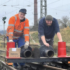 Nachdem wir uns mit der Pflasterei im Vormonat leicht verausgabt haben, konnten wir uns wieder anderen Dingen zuwenden. Der Jung-Rangiertraktor unseres Vereinskollegen hat nur endlich wieder seine Puffer zurück, was das Verschieben des Fahrzeugs deutlich vereinfacht. Auf dem ehemaligen Fundament des Schlackekrans findet sich nun ein kurzes Gleisjoch, bereit zur Aufnahme des 01-Radsatzes. Unterdessen konnte auch der Packwagen weitestgehend von Müll befreit und eines der zerstörten Fenster erneuert werden.